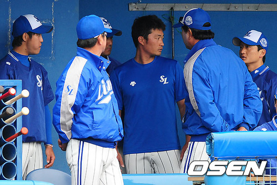 경기중 삼성 오승환이 더그아웃에서 코칭스태프와 이야기를 나누고 있다.