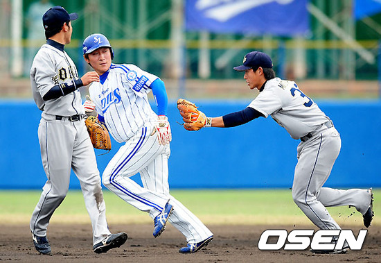 2말 2사 1,2루에서 삼성 박한이의 적시타에 협살에 걸린 배영섭이 태그아웃당하고 있다.