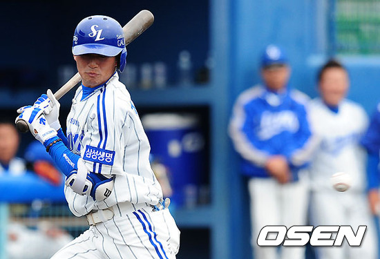 2회말 삼성 김상수가 몸쪽 공에 놀라고 있다. 김상수는 사구로 출루
