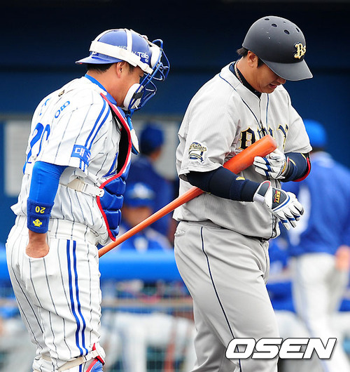 2회초 오릭스 이대호가 타석에 들어서며 삼성 포수 진갑용과 이야기를 나누고 있다.