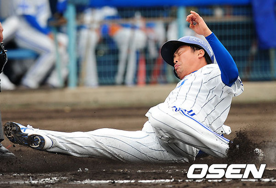 1회말 1사 1,2루에서 삼성 최형우의 적시타에 박한이에 홈에서 세이프되고 있다.