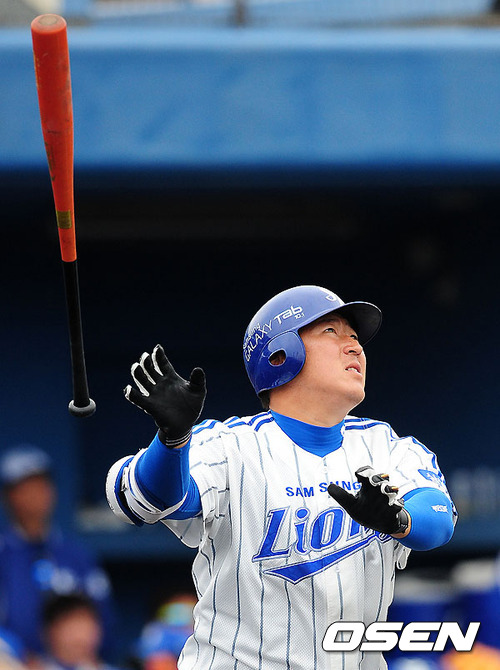 1회말 1사 1,2루에서 삼성 최형우가 홈런성 파울 타구를 바라보고 있다.