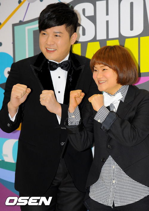 21일 오후 서울 광장동 악스홀에서 진행된 MBC 뮤직 차트쇼 프로그램 '쇼 챔피언' 기자간담회에서 신동과 김신영이 포즈를 취하고 있다.