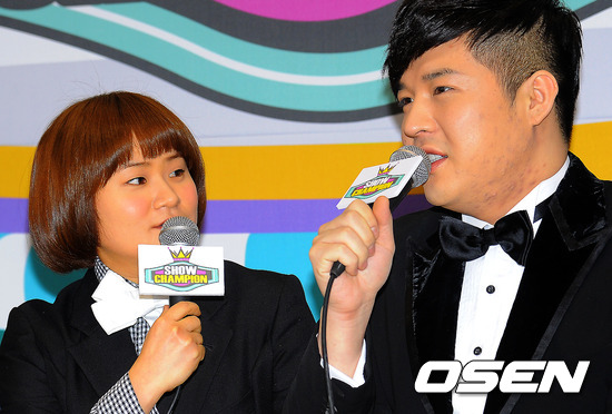 21일 오후 서울 광장동 악스홀에서 진행된 MBC 뮤직 차트쇼 프로그램 '쇼 챔피언' 기자간담회에서 신동과 김신영이 소감을 말하고 있다.