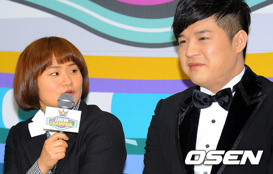 21일 오후 서울 광장동 악스홀에서 진행된 MBC 뮤직 차트쇼 프로그램 '쇼 챔피언' 기자간담회에서 신동과 김신영이 소감을 말하고 있다.