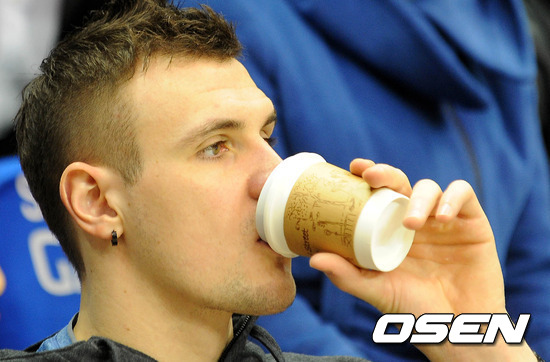 21일 오후 서울 잠실 실내체육관에서 열린 '2011-2012 KB국민카드 프로농구' 서울 삼성과 부산 KT의 경기, 경기 전 삼성화재 가빈이 커피를 마시며 경기 시작을 기다리고 있다.