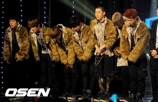 21일 오후 서울 광장동 악스홀에서 진행된 MBC 뮤직 차트쇼 프로그램 '쇼 챔피언' 생방송에서 그룹 블락비가 팬들에게 인사를 하고 있다.
