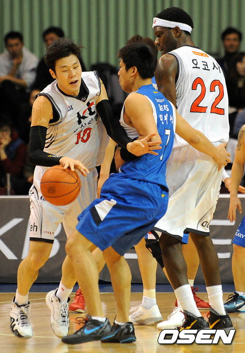 21일 오후 서울 잠실 실내체육관에서 열린 '2011-2012 KB국민카드 프로농구' 서울 삼성과 부산 KT의 경기, 1쿼터 KT 조성민이 삼성 이병석을 돌파하고 있다.
