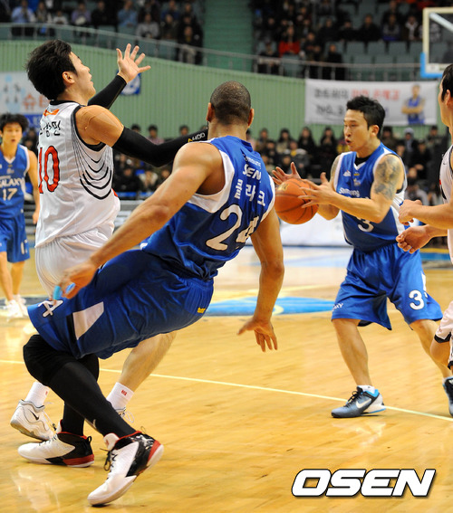 21일 오후 서울 잠실 실내체육관에서 열린 '2011-2012 KB국민카드 프로농구' 서울 삼성과 부산 KT의 경기, 2쿼터 삼성 클라크가 넘어지며 김승현에게 패스를 하고 있다.