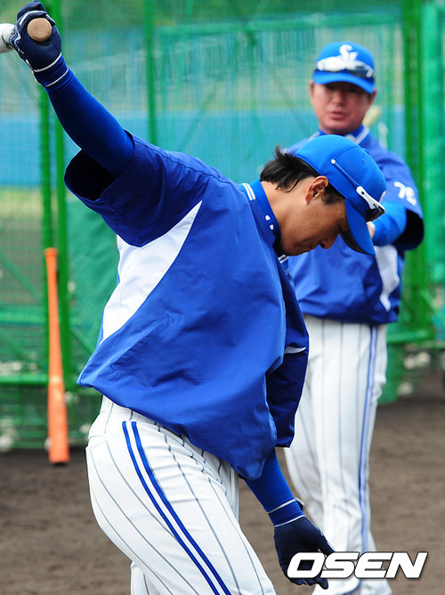 류중일 감독 지시에 따라 자세 교정하는 이승엽