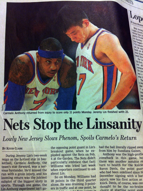 린은 네츠와 경기서 21득점 7리바운드 9어시스트 4스틸로 맹활약했다. 다만 팀의 패배로 빛이 바랐을 뿐이다. 22일 미국의 월스트리트 저널은 "네츠가 린새니티를 막았다"고 보도했다. 닉스의 특급스타 카멜로 앤서니가 부상에서 복귀했음에도 린에 대한 집중은 여전했다.