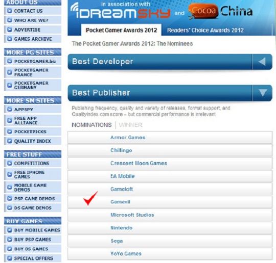 해외 유명 게임 전문지인 포켓게이머에 모바일 업체 게임빌이 ‘베스트 퍼블리셔’의 후보에 올라 화제다. 최근 포켓게이머는 ‘Pocket Gamer Awards 2012’의 베스트 퍼블리셔 부문에서 전 세계 모바일게임 시장에서 두각을 나타내고 있는 글로벌 퍼블리셔 10개사를 선정했다. 후보사들 중 게임빌도 한 자리를 차지하며 글로벌 퍼블리셔로서 게임빌의 위상을 확인했다.
