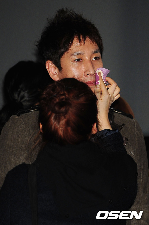 22일 오후 서울 용산 CGV에서 열린 배우 이선균, 김민희, 조성하 주연의 영화 '화차'(변영주 감독) 시사회에서 포토타임 전 이선균이 메이크업을 받고 있다.