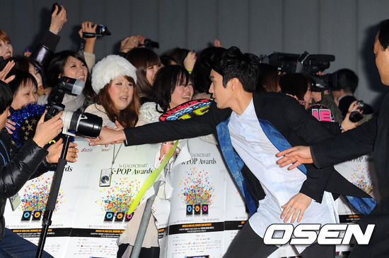 22일 오후 서울 한남동 블루스퀘어 삼성카드홀에서 열린 '제1회 가온차트 K-POP 어워드'에서 그룹 슈퍼주니어 최시원이 펜스가 넘어지려 하자 달려가 펜스를 잡고 있다.