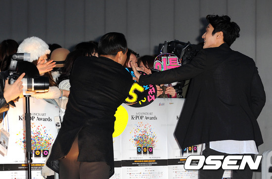 22일 오후 서울 한남동 블루스퀘어 삼성카드홀에서 열린 '제1회 가온차트 K-POP 어워드'에서 무너지는 펜스를 막은 슈퍼주니어 최시원이 팬들에게 괜찮다는 제스처를 취하고 있다.