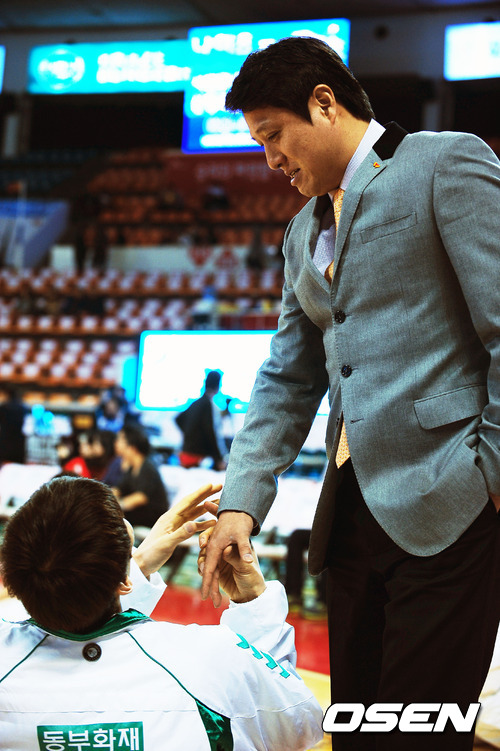 22일 오후 서울 잠실 학생체육관에서 열린 '2011~2012 KB국민카드 프로농구' 서울 SK와 원주 동부의 경기에서 1쿼터 SK 문경은 감독 대행이 동부 김주성과 악수를 나누고 있다.