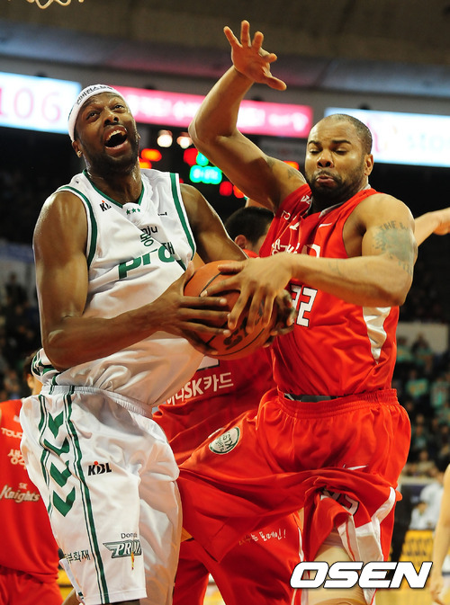 22일 오후 서울 잠실 학생체육관에서 열린 '2011~2012 KB국민카드 프로농구' 서울 SK와 원주 동부의 경기에서 2쿼터 SK 알렉산더 존슨이 동부 로드 벤슨이 슛을 하려 할때 볼을 치고 있다.