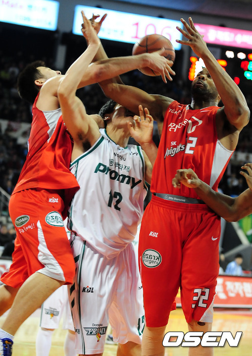 22일 오후 서울 잠실 학생체육관에서 열린 '2011~2012 KB국민카드 프로농구' 서울 SK와 원주 동부의 경기에서 2쿼터 동부 김봉수가 볼다툼 중 SK 존슨의 팔에 얼굴을 맞고 있다.