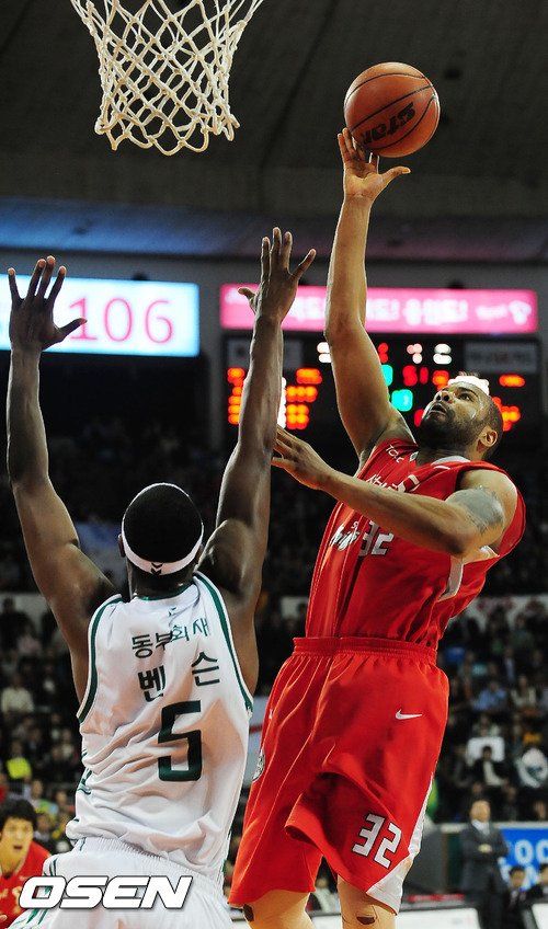 22일 오후 서울 잠실 학생체육관에서 열린 '2011~2012 KB국민카드 프로농구' 서울 SK와 원주 동부의 경기에서 3쿼터 SK 존슨이 동부 벤슨의 블로킹을 피해 레이업슛을 날리고 있다.