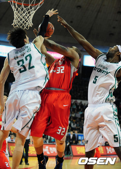 22일 오후 서울 잠실 학생체육관에서 열린 '2011~2012 KB국민카드 프로농구' 서울 SK와 원주 동부의 경기에서 4쿼터 SK 존슨이 동부 김주성과 벤슨의 블로킹을 뚫고 슛을 성공시키고 있다.