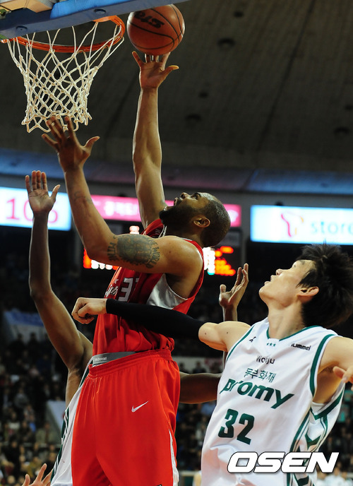 22일 오후 서울 잠실 학생체육관에서 열린 '2011~2012 KB국민카드 프로농구' 서울 SK와 원주 동부의 경기에서 4쿼터 SK 존슨이 동부 벤슨과 김주성을 뚫고 슛을 성공시키고 있다.