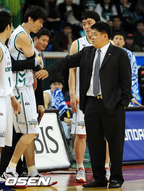 22일 오후 서울 잠실 학생체육관에서 열린 '2011~2012 KB국민카드 프로농구' 서울 SK와 원주 동부의 경기에서 4쿼터 동부 김주성이 심판 판정에 강하게 항의하자 동부 강동희 감독이 이를 말리고 있다.
