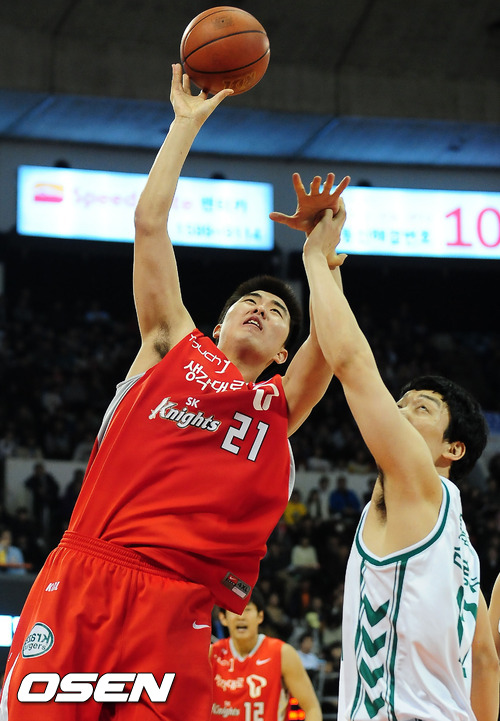 22일 오후 서울 잠실 학생체육관에서 열린 '2011~2012 KB국민카드 프로농구' 서울 SK와 원주 동부의 경기에서 4쿼터 SK 김우겸이 동부 김봉수의 블로킹을 피해 슛을 날리고 있다.