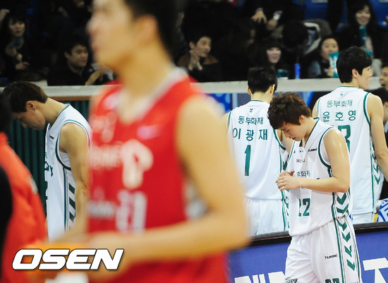 경기를 마치고 승리의 기쁨을 나누는 SK 선수들 뒤로 동부 선수들이 고개를 숙인채 퇴장하고 있다. / rumi@osen.co.kr