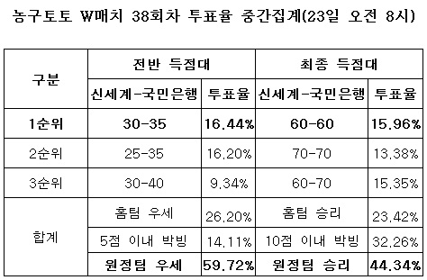 농구토토 W매치 38회차는 경기시작 10분 전인 24일 오후 4시 50분 발매가 마감된다.