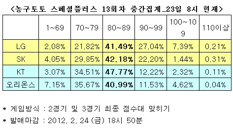 [농구토토] 국민체육진흥공단(www.kspo.or.kr)이 발행하는 체육진흥투표권 수탁사업자인 스포츠토토 공식 온라인 발매 사이트인 베트맨(www.betman.co.kr)은 24일 오후 7시부터 펼쳐지는 LG-SK(1경기)전, KT-오리온스(2경기)전 등 국내 프로농구 2경기를 대상으로 한 농구토토 스페셜플러스 13회차 투표율 중간집계 결과, 참가자들은 2경기 KT-오리온스전에서 양 팀간 박빙 승부가 벌어질 것으로 예상했다고 전했다.