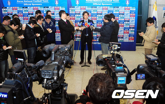 2012 런던올림픽 아시아지역 최종예선 5차전 오만과의 경기를 마치고 23일 오후 귀국한 올림픽대표팀 홍명보 감독이 인천국제공항 입국장에서 취재진들과 인터뷰를 하고 있다.