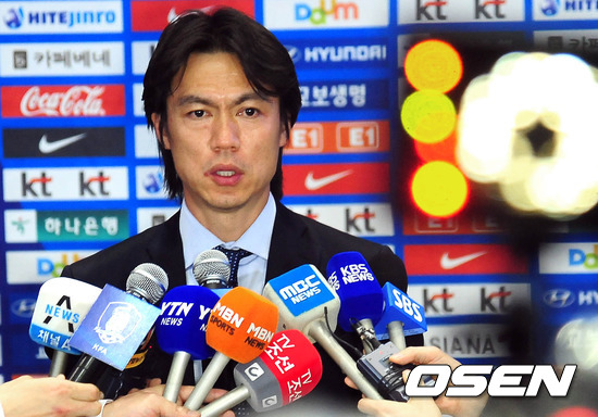 2012 런던올림픽 아시아지역 최종예선 5차전 오만과의 경기를 마치고 23일 오후 귀국한 올림픽대표팀 홍명보 감독이 인천국제공항 입국장에서 인터뷰를 하고 있다.