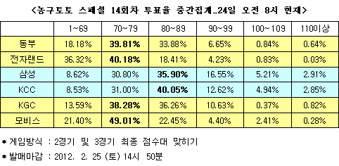 국내 프로농구 3경기 대상 농구토토 스페셜 14회차 투표율 중간집계. 25일(토) 오후 2시 50분 발매마감