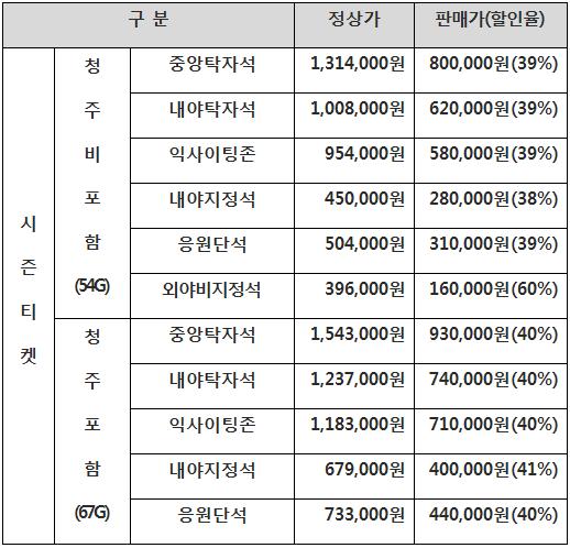 2012 시즌 티켓은 청주 홈경기를 포함한 홈67경기 시즌 티켓과 대전 홈경기 관람만 가능한 홈 54경기 시즌 티켓으로 나누어 진다. 청주 경기를 포함한 중앙탁자석 시즌 티켓은 정상가 1,549,000원에서 40% 할인된 930,000원에, 내야 지정석은 정상가 670,000원에서 40%할인된 400,000원에 판매된다.