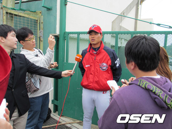 김상현이 24일 SK와의 연습경기를 마치고 취재진과 인터류를 하고 있다.