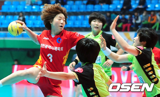 24일 오후 인천 도원체육관에서 열린 '2012 SK핸드볼코리아리그' 컬러풀대구와 인천체육회의 경기 전반 인천체육회 조효비가 슛을 시도하고 있다.