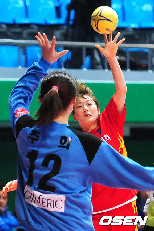 24일 오후 인천 도원체육관에서 열린 '2012 SK핸드볼코리아리그' 컬러풀대구와 인천체육회의 경기 전반 인천체육회 김선화가 슛을 시도하고 있다.
