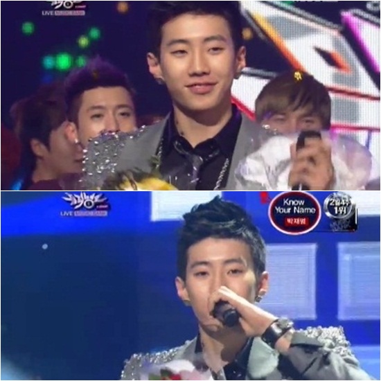 박재범은 24일 오후 생방송으로 진행된 KBS 2TV '뮤직뱅크'에서 '노우 유어 네임'(Know Yorn Name)으로 컴백 후 첫 1위를 차지하는 영광을 안았다.