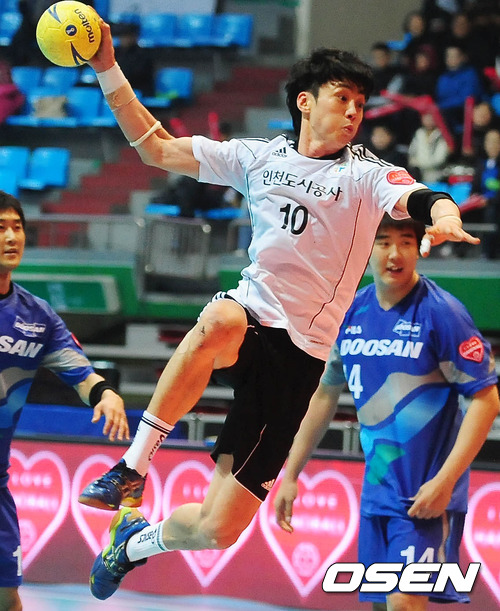 24일 오후 인천 도원체육관에서 열린 '2012 SK핸드볼코리아리그' 인천도시공사와 두산의 경기 전반 인천도시공사 박찬용이 슛을 시도하고 있다.