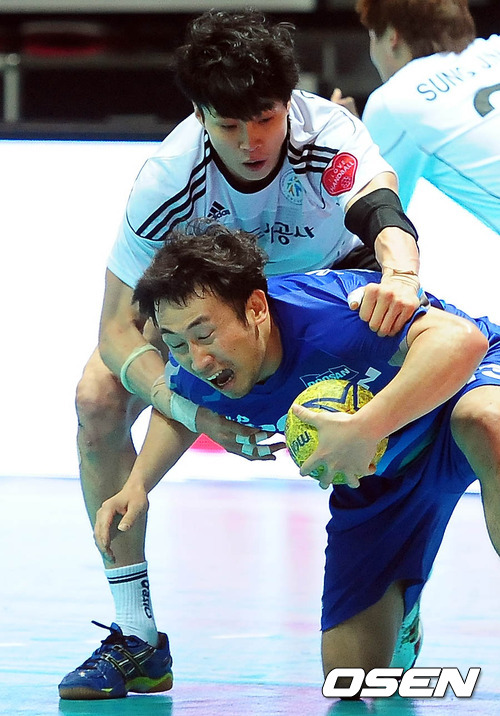 24일 오후 인천 도원체육관에서 열린 '2012 SK핸드볼코리아리그' 인천도시공사와 두산의 경기 후반 두산 이재우와 인천도시공사 박찬용이 볼다툼을 하고 있다.