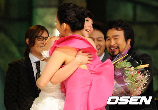 24일 오후 서울 서초동 한전아트센터에서 열린 tvN '오페라스타 2012' 3라운드 경연에서 탈락을 한 다나가 한경미 심사위원과 포옹을 나누고 있다.