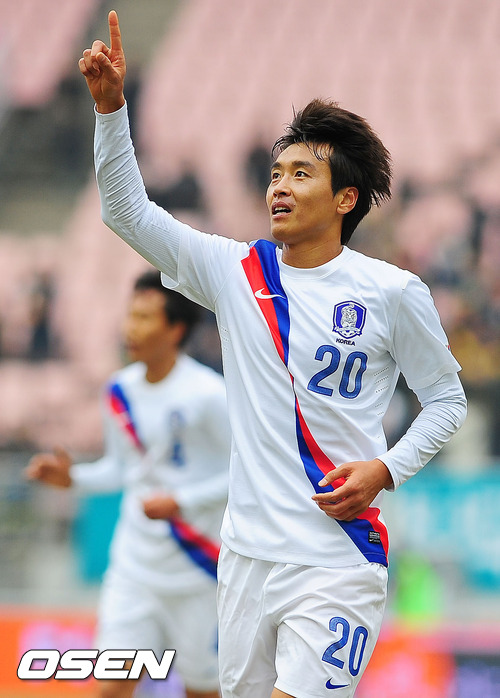 25일 오후 전주월드컵경기장에서 열린 최강희 감독이 이끄는 한국축구대표팀과 우즈베키스탄과의 평가전에서 전반 이동국이 팀 첫번째 골을 성공시킨 후 키스 세레머니를 하고 있다.