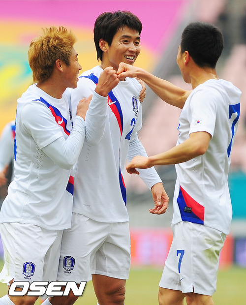 25일 오후 전주월드컵경기장에서 열린 최강희 감독이 이끄는 한국축구대표팀과 우즈베키스탄과의 평가전에서 전반 이동국이 팀 첫번째 골을 성공시킨 후 이근호 김두현과 기쁨을 나누고 있다.