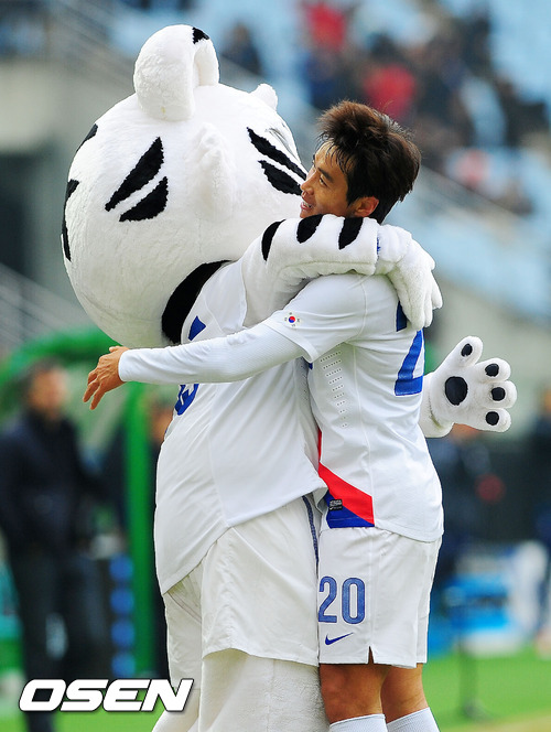 25일 오후 전주월드컵경기장에서 열린 최강희 감독이 이끄는 한국축구대표팀과 우즈베키스탄과의 평가전에서 전반 이동국이 선취골에 이어 팀 두번째 골을 성공 시킨 후 백호와 포옹을 하고 있다.