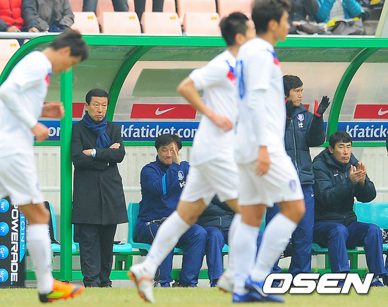 25일 오후 전주월드컵경기장에서 열린 최강희 감독이 이끄는 한국축구대표팀과 우즈베키스탄과의 평가전 전반 이동국이 추가골을 넣었다. 최강희 감독이 표정 변하지 않고 선수들을 바라보고 있다.