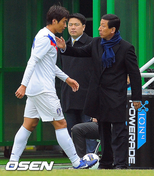 25일 오후 전주월드컵경기장에서 열린 최강희 감독이 이끄는 한국축구대표팀과 우즈베키스탄과의 평가전 후반 최강희 감독이 교체되는 이동국을 격려하고 있다.