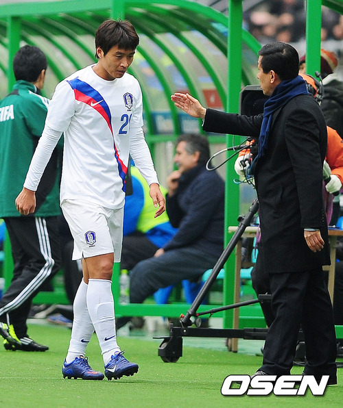 25일 오후 전주월드컵경기장에서 열린 최강희 감독이 이끄는 한국축구대표팀과 우즈베키스탄과의 평가전에서 후반 이동국이 교체되어 들어오며 최강희 감독에게 인사를 하고 있다.