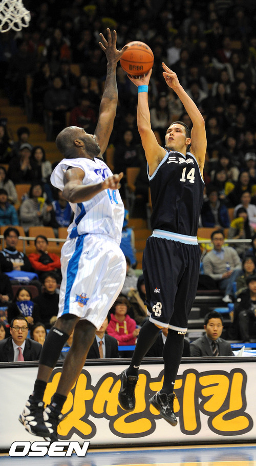 25일 오후 서울 잠실 실내체육관에서 열린 '2011-2012 KB국민카드 프로농구' 서울 삼성과 전주 KCC의 경기, 4쿼터 삼성 이승준이 KCC 왓킨스의 슛블록을 피해 슛을 시도하고 있다.