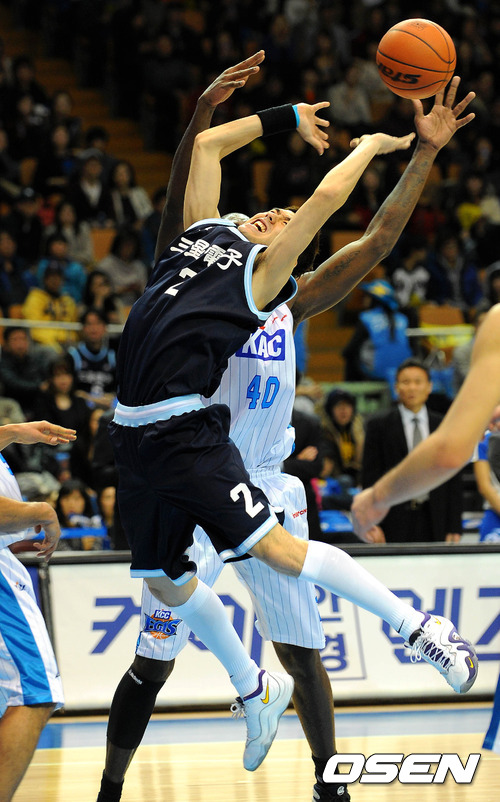 25일 오후 서울 잠실 실내체육관에서 열린 '2011-2012 KB국민카드 프로농구' 서울 삼성과 전주 KCC의 경기, 4쿼터 삼성 이관희가 KCC 왓킨스에게 반칙을 당하고 있다.