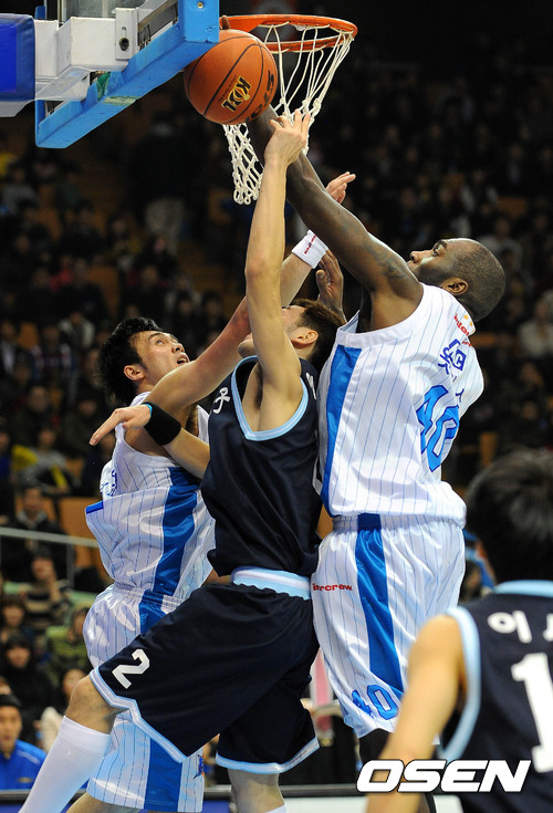 25일 오후 서울 잠실 실내체육관에서 열린 '2011-2012 KB국민카드 프로농구' 서울 삼성과 전주 KCC의 경기, 4쿼터 삼성 이관희가 KCC 왓킨스의 슛블록에 당하고 있다.